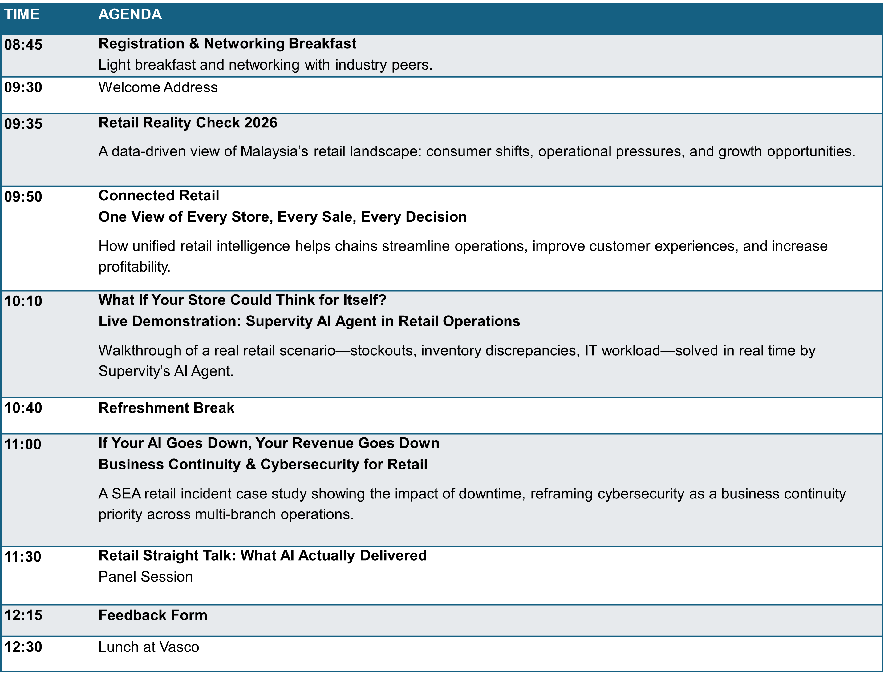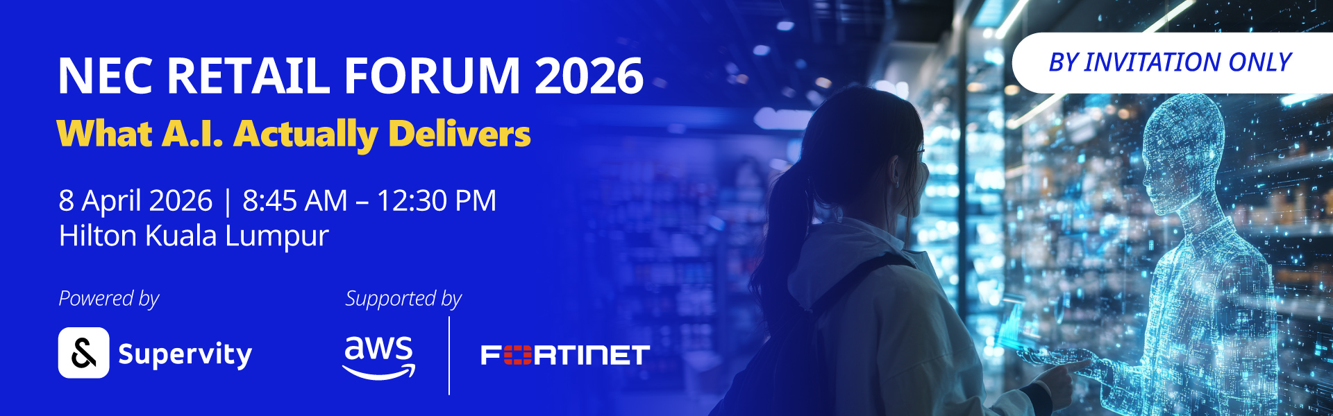 This session will spotlight the opportunities and practical realities of modern retail — from connected intelligence and autonomous store operations to cybersecurity resilience and business continuity. Featuring perspectives from leading industry and technology voices, including NEC Malaysia, Supervity, Fortinet and AWS.